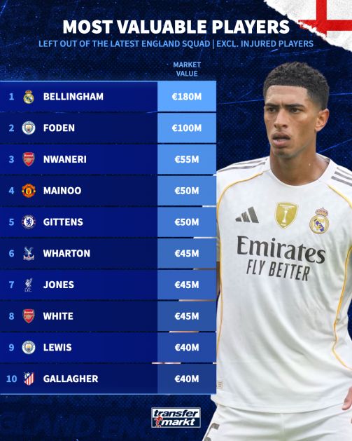 Leisu Sports在10月3日报道说,英格兰队宣布了新的阵容,德国记录了未被选为英格兰这个名单的球员的价值清单(不包括受伤的球员)。 The specific list is as follows: Bellingham (Real Madrid) 180 million Euro Foden (Manchester City) 100 million Euro Euro Nvaneri (Arsenal) 55 million Euro Menu (Manchester United) 50 million Euro Gittens (Chelsea) 50 million Euros Walton (Crystal Palace) (Arsenal) (Manchester City) 40 million Euro Gallagher (Atletico Madrid) 40 million euro