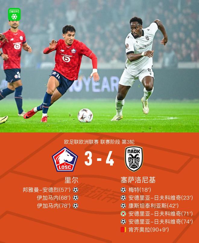 北京时间10月24日,欧国联第三轮比赛,里尔对阵塞萨洛尼基。利尔邦·亚曼-安德烈进球,伊加马内梅开二度。塞萨洛尼基梅特进球,安德烈亚·日夫科维奇梅开二度,康斯坦蒂拉斯进球。最终比分是里尔3-4塞萨洛尼基。主赛事第18分钟,日夫科维奇助攻,梅特弧顶突射,塞萨洛尼基1-0。第23分钟,米凯利迪斯长传后,日夫科维奇推射破门,第42分钟塞萨洛尼基2-0。康斯坦蒂拉斯近角低射再进一球。塞萨洛尼基 3-0 里尔。第57分钟,维尔东克开出角球,安德烈头球破门扳回一分。里尔1-3。第68分钟,维尔东克角球助攻,伊加马内线头球破门,里尔2-3康斯坦蒂拉斯创造点,第74分钟日夫科维奇错失点球,德斯波多夫助攻,日夫科维奇完成双射,塞萨洛尼基4-2,第7第8分钟,伊加马内抽射梅开二度,里尔3-4塞萨洛尼基。双方球员在激动人心的时刻进入了比赛。第5分钟,比赛即将开始。康斯坦蒂拉斯禁区左侧内切射门。奥泽尔侧身扑出球。第18分钟,日夫科维克助攻,梅特弧顶处突射,塞萨洛尼基1-0。第23分钟,米凯利迪斯长传,日夫科维奇推射破门。塞萨洛尼基 2-0。第42分钟,帕尔多被拉入禁区,主裁判观看VAR后返回,警告没有点球。第42分钟,康斯坦蒂拉斯近角射门再下一城。塞萨洛尼基 3-0 里尔。第52分钟,拉霍贝尔弧顶处射门,皮球偏出球门。第57分钟,维尔东克角球传出,安德烈头球破门扳回一分,里尔1-3。第68分钟随后,维尔东克角球再次助攻,伊加马内头球破门,里尔2-3,康斯坦特拉斯建点,第74分钟日夫科维奇罚丢点球。德斯波多夫助攻,日夫科维奇破门完成双环,塞萨洛尼基4-2。第78分钟,伊加马内抽射破门完成双环,里尔3-4特萨洛尼基报道详情