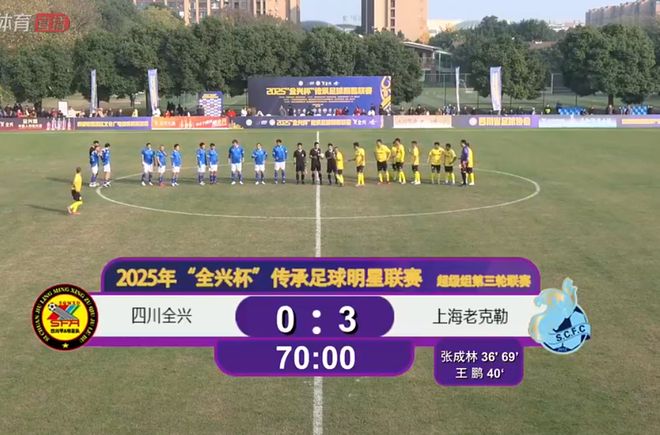 12月10日下午,2025年“全兴杯”传承足球明星联赛(原“老甲A”)第三轮在成都谢菲联足球基地再战两场。结果,上海老客乐在中超组以3-0战胜四川全兴,豪取3连胜,距离第三冠也很近。作为东道主,四川全兴遭遇三连败,拉响了保级警报。冠军赛中,天津老甲队1-2不敌深圳传承之星,遭遇首败。前三轮每天一场,各队进行特定的一轮比赛。上海老客乐主教练奚志康安排程亮担任场上队长,范志毅、荣浩、胡兆军、胡云峰、张成林等人上场。其中,范志毅担任前锋和箭头。四川全兴主教练于东风继续培养右后卫魏群担任场帽坦。邹有根、马泉、甘英博、陈少钦等各个年龄段的球员亮相场上。当魏群与卫冕冲锋志毅的线路相遇并同场较量时,甲A赛场的双方比赛场面立刻爆满。不过,过去范志毅主要踢后卫,他和魏群很少正面交锋。上半场双方0-0战平。但下半场刚开始2分钟,上海老克乐就由U40球员张成林的进球打破了僵局。这也是张成林本次比赛的第四粒进球。目前,他在得分手名单中名列前茅。仅仅4分钟,上海老克勒就由王鹏攻入一球,比分变为2-0。连丢2球后,四川全兴加强进攻,但未能取得进球。相反,补时阶段,上海老克勒张成林抽射破门,将比分定为3-0。最终,上海老客乐沃3连胜并继续领先,轻松拿到第三个冠军。主场作战的四川全兴,遭遇1平2负,3轮不胜,敲响了保级警报。同时开始的一场冠军赛中,志在重返中超组的天津老甲A在两连胜的背景下,本轮1-2不敌深圳传承之星,为被追赶的希望增添了变数。比赛中,深圳队首先由谌龙打破僵局;随后,天津队白伊防守失误,打进乌龙球。随后,白伊补射,帮助佐里奇头球破门,扳回1球。